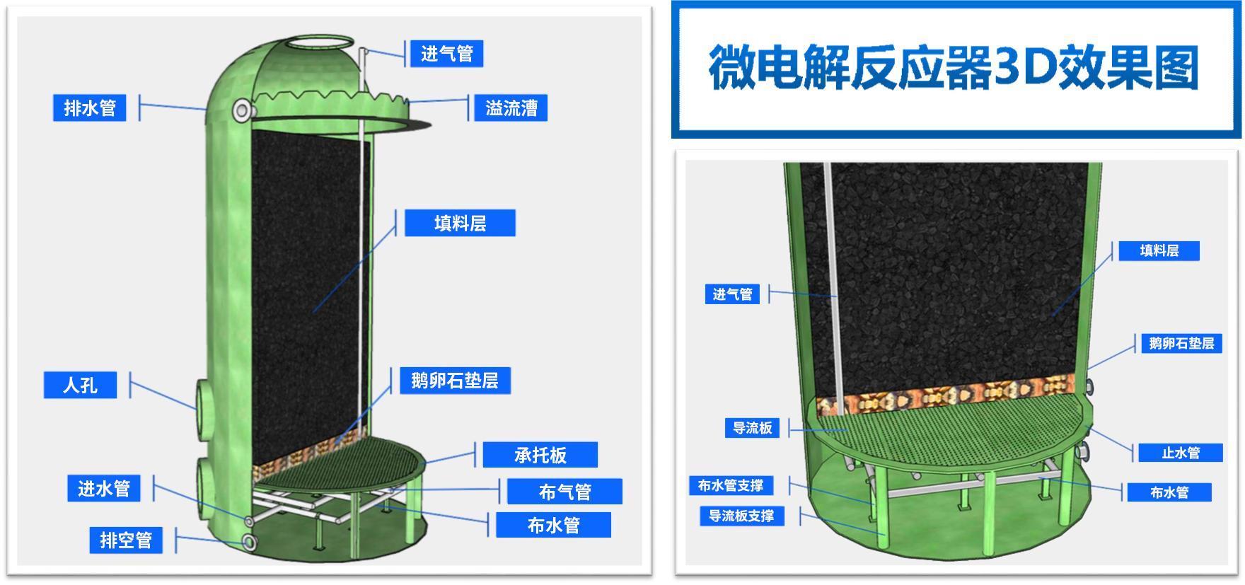 當系統(tǒng)通水后,利用“腐蝕電池原理”自身產生1.2V電位差對廢水進行電解處理,設備內會形成無數(shù)的微電池系統(tǒng),在其作用空間構成無數(shù)個電場。