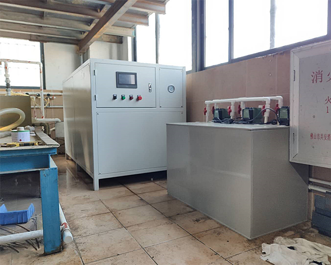 五金表面清洗廢水經(jīng)鋪設(shè)的排水管網(wǎng)流入調(diào)節(jié)池中,均質(zhì)均量,池內(nèi)設(shè)液位控制器,控制方式高開低停。均化后的廢水經(jīng)污水提升泵泵至反應(yīng)池,通過自動(dòng)加藥系統(tǒng)往池內(nèi)投加藥劑,與廢水充分反應(yīng)后自流流入中間池,然后再流入凈化池處理,凈化完畢后流入高級(jí)氧化池,往池內(nèi)投加氧化助劑,在高級(jí)氧化系統(tǒng)的作用下將廢水里的污染物深度處理,處理后的水流入清水池,經(jīng)清水泵泵至過濾系統(tǒng)過濾處理后可達(dá)標(biāo)排放或回用。